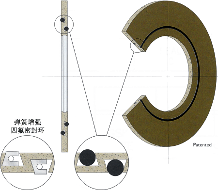 - 弹簧压紧聚四氟乙烯密封圈可以提供径向负载并通过安放在密封槽内消除了冷流。这种密封方式使 PGE 和其他所有密封系统都有本质的区别。