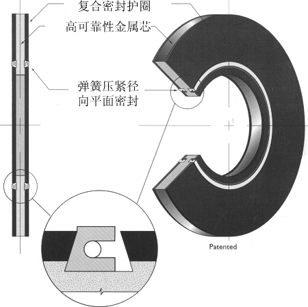 VCS独特的专利设计结合了高强度的内含不锈钢芯强化的玻璃纤维增强环氧树脂层压板,这提供了在保持两个法兰面完全电绝缘时可具有传统金属垫片相当的强度。密封槽穿过层压绝缘板材并深入不锈钢芯板。这为密封件的定位提供了坚实的基础,并可以阻断玻璃纤维层压板固有的泄漏通道。安装在楔形密封槽中弹簧压紧特氟隆内面密封可以提供独特的动压密封效果,这一型式不同于其他所有高压绝缘垫片(必要时也可以选用氟橡胶O型圈)。