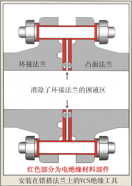 除了其出众的密封性能之外,VCS是一款高强度的电绝缘法兰垫片。VCS通过使用不导电的非金属密封面显著地降低了法兰面之间的电动势,并有效地消除了由异金属接触引起的腐蚀或由大地电流引起的金属管件的腐蚀。当使用绝缘护套和垫圈时,VCS可有效切断带阴极保护的管路系统的电传导。和其他绝缘垫片相比,VCS的特性是其强度和耐久性。传统意义上的绝缘垫片通常都是使用易碎的非金属材料(例如酚醛树脂)制作的,无法承受不正确的安装而容易碎裂和失效。和传统的绝缘垫片相比,VCS的钢芯和它的专利结构使其可以经受住更大的系统压力、压力循、弯曲应力、过压和误用而无失效风险。