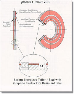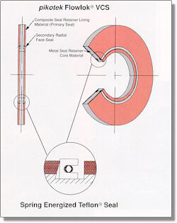 The Flowlok is composed of essentially two independent sealing components, a high modulus composite-lined structural seal retainer and a secondary pressure-energized radial face seal. The primary sealing element is the composite seal retainer lining material located outside of the secondary radial face seal.
